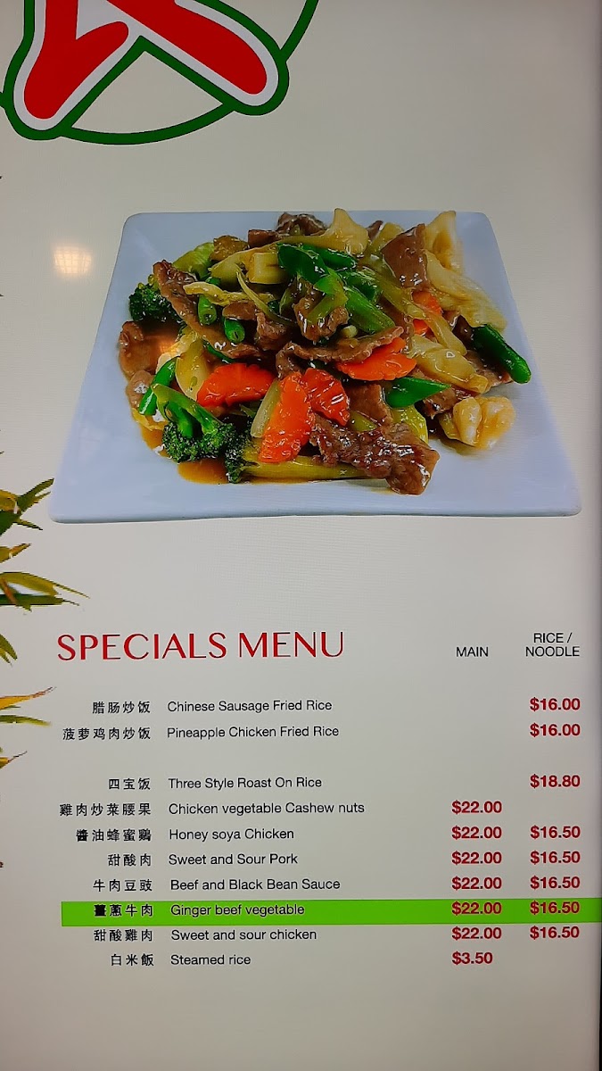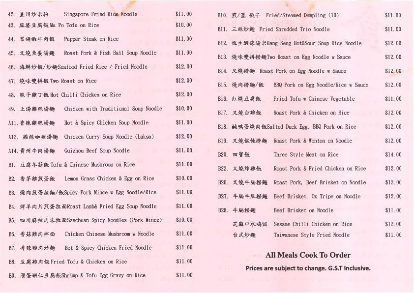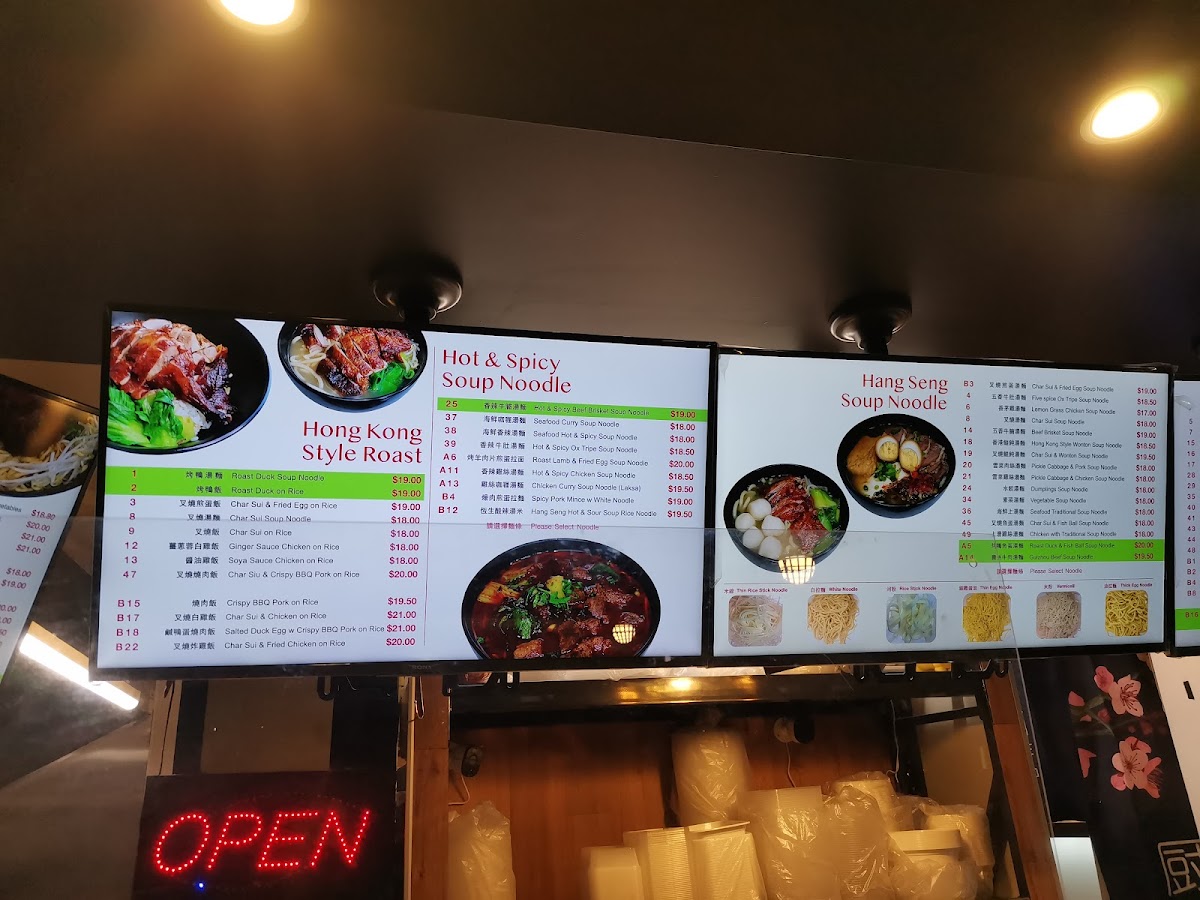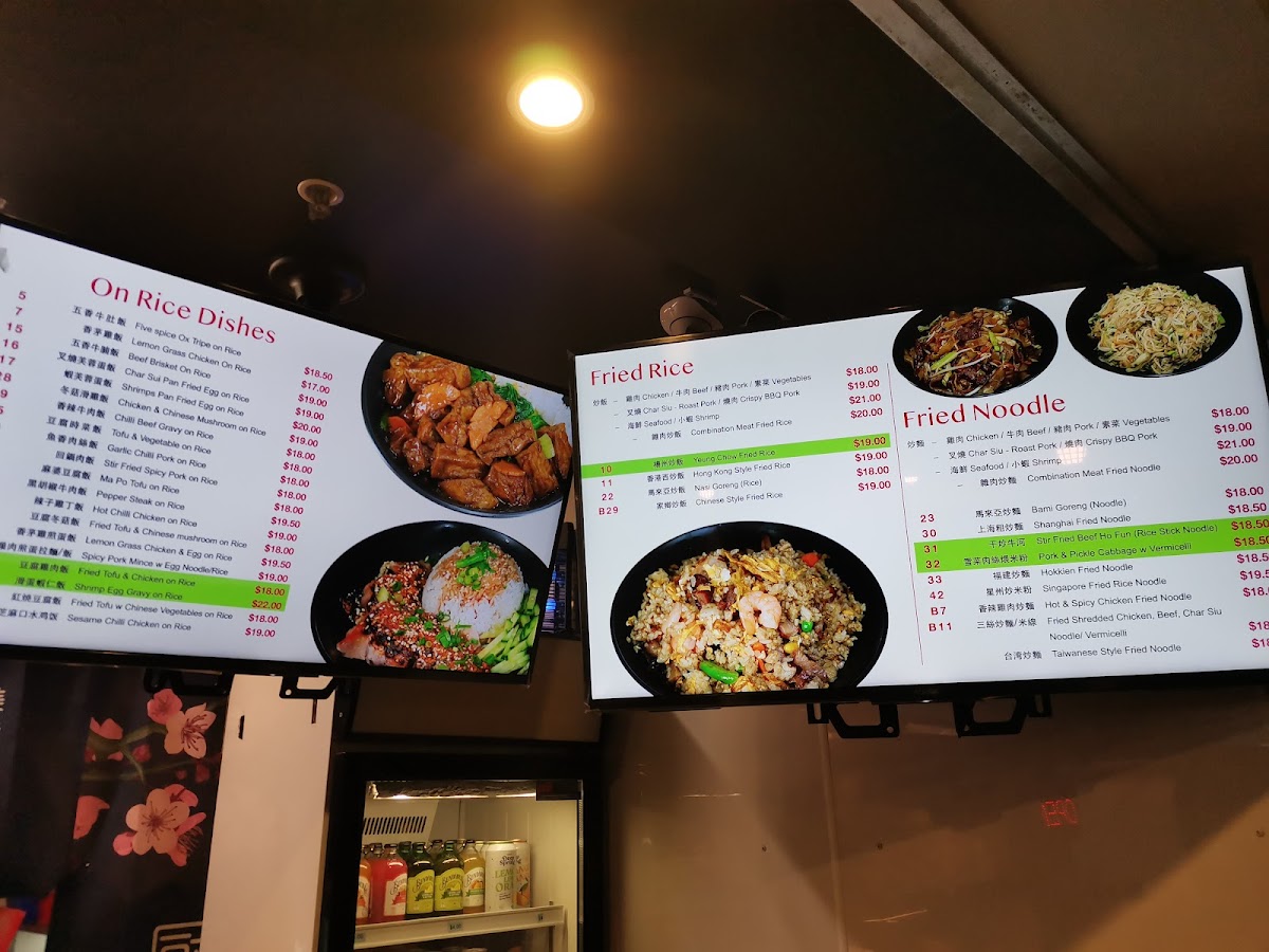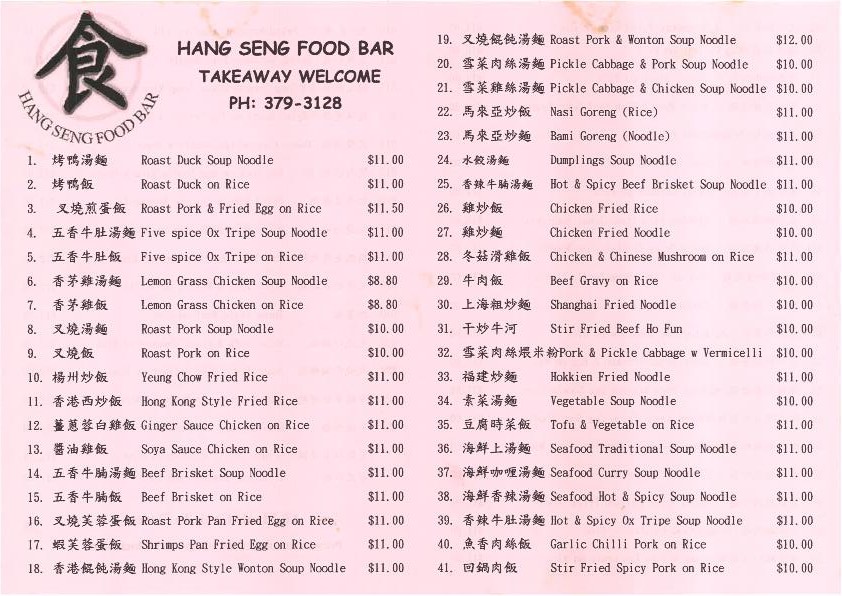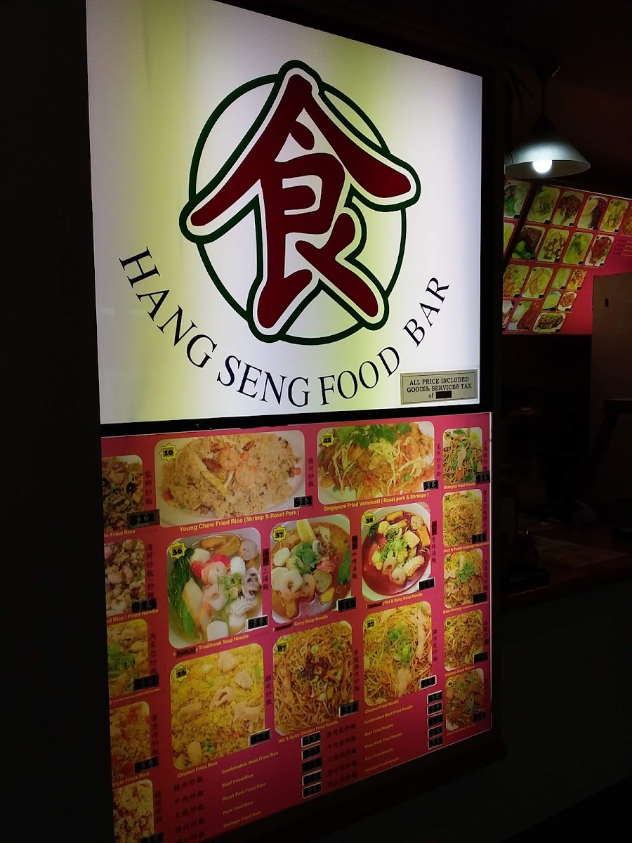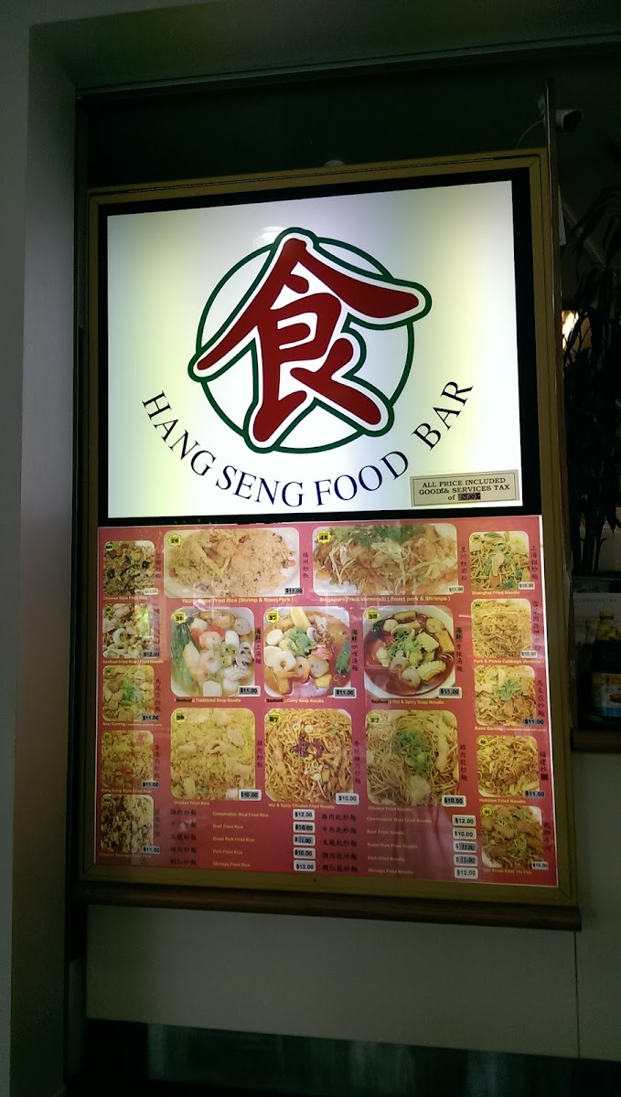 The menu at Hang Seng Food Bar offers a delightful variety of flavorful dishes that highlight both traditional and contemporary Asian cuisine. For rice dishes, you'll find 麻婆豆腐飯 and Five Spice Ox Tripe On Rice, alongside options like Char Sui Pan Fried Egg On Rice and Stir Fried Spicy Pork On Rice. Fried rice lovers can enjoy specialties like 雜肉炒飯, Yeung Chow Fried Rice, and the aromatic Nasi Goreng. The fried noodle section includes favorites such as Combination Meat Fried Noodle, Shanghai Fried Noodle, and Singapore Fried Rice Noodle. If you're craving roasted meat, the Roast Duck On Rice and Char Sui On Rice are must-tries, or you can go for a comforting bowl of Char Sui Soup Noodle. For soup lovers, options like Roast Lamb & Fried Egg Soup Noodle and Hot & Spicy Beef Brisket Soup Noodle provide rich, satisfying flavors. The specials menu offers tempting choices such as 腊肠炒饭 and Honey Soya Chicken, while Sweet And Sour Pork brings a classic touch to the selection. Whether you're in the mood for something spicy, savory, or comforting, Hang Seng Food Bar's menu promises a delicious experience with something for every palate.